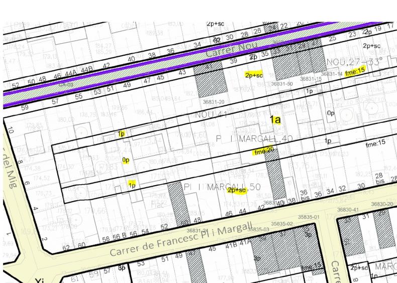 La parcela tiene una superficie de 313 m², un fondo de 49,75 metros y una edificabilidad por ambas calles de 15 metros de profundidad, con ampliación en planta baja de 5 metros adicionales por la calle Pi i Margall y 2 metros adicionales por la calle Nou. El techo total edificable es de unos 490 m2 aproximadamente.